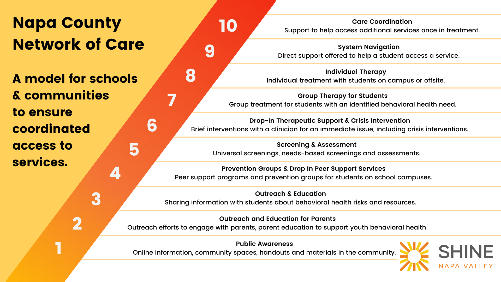 SHINE provides targeted recovery services to address the impacts of traumas like wildfires, COVID-19, or dealing with the death of a loved one. SHINE receives matching funds from both Napa County and the State of California to support these efforts.SHINE agencies organized a youth-led and county-wide stigma reduction campaign.